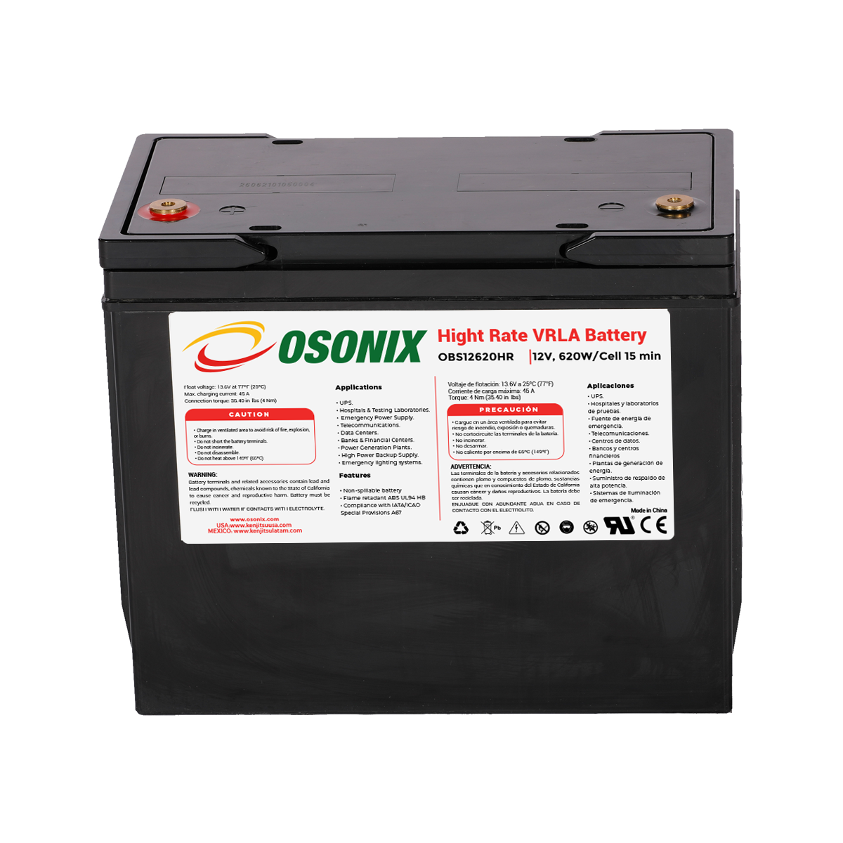 La serie OSONIX High Rate Battery incorpora tecnología avanzada VRLA y AGM diseñada para el mayor rendimiento en aplicaciones de suministro de energía y UPS mediante el uso de una rejilla resistente y una placa de pasta especial para asegurar un rendimiento estable extra duradero con 12 años de vida útil.